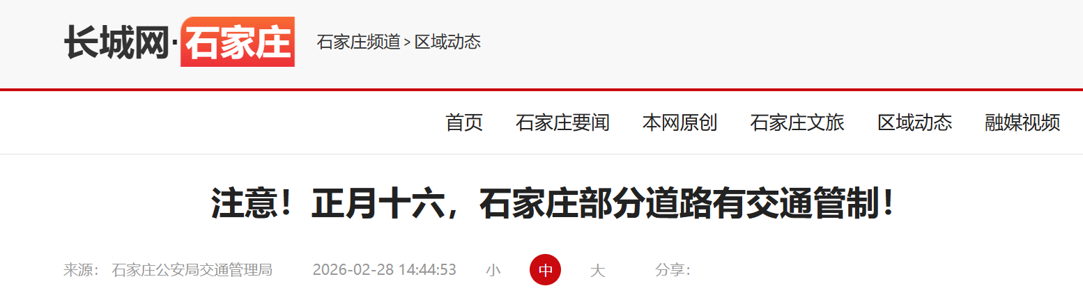 石家庄市公安局交通处置局 对于鹿泉区正月十六花会展演行径技术 交通持续的宣布 鹿泉区将于正月十六举办民间花会展演行径,为保险行径获胜进行,确保行径技术临近说念路交通安全、有序、畅达,笔据《中华东说念主民共和国说念路交通安全法》第三十九条之范例,石家庄市公安局交通处置局决定在行径技术春联系说念路引申分时、分段交通持续。现将行径全程交通处置措施赐与宣布如下: 行径技术交通持续时刻 2026年3月4日(农历正月十六)上昼7:30-12:00,九游会j9北斗路(翠屏大街至海山大街段)、威远街、晨曦大街(新康路至镇宁路段)、石邑街(新康路至镇宁路段)将引申临时交通持续,退却一切车辆通行。 临时交通管控说念路还原通行时刻,由公安机关交通处置部门笔据行径情况决定,请各界全球给予蚁集因循,合理承袭出行澄清。 特此宣布。 石家庄市公安局交通处置局 2026年2月28日 开头:长城网
