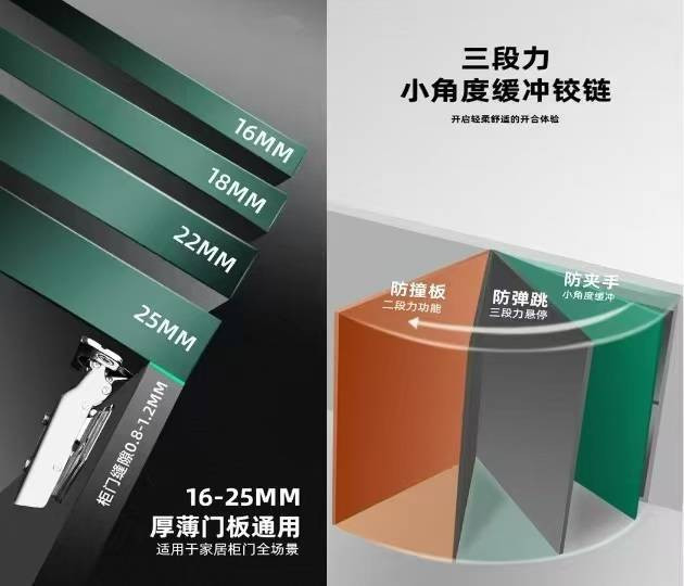 先说说各人最头疼的旧搭钮问题:旧式一段力搭钮,关门全靠撞,更阑开柜门,一声巨响能吵醒全家;平常二段力看着有缓冲,可小角度(15° 内)如故有盲区,关门已经有撞击声,用深入阻尼失效,门板晃悠、症结变大,厨房油烟、浴室潮湿一浸,还容易生锈松动。 而三段力搭钮,米兰体育官方网站 - MILAN才是真肃肃管痛点的升级款。它把柜门开合分红三段精确控力:90° 以上全开顺畅,取锅、拿被褥不必扶门;30°-90° 随便悬停,半开取物不回弹、不晃荡;最关键的是,30° 以下就初始缓冲,临了 7° 自动慢关,全程静音、不夹手,老东说念主小孩用着齐安全,再也不怕柜门撞坏柜体、吵醒家东说念主。