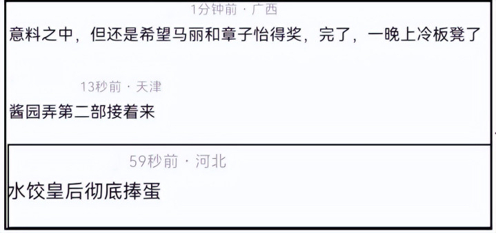 而此前备受看好的章子怡、马丽则全程陪跑,她们主演的《酱园弄》《水饺皇后》在本届金像奖上尽然一无所获。这晚,两位实力派女星坐足了冷板凳。