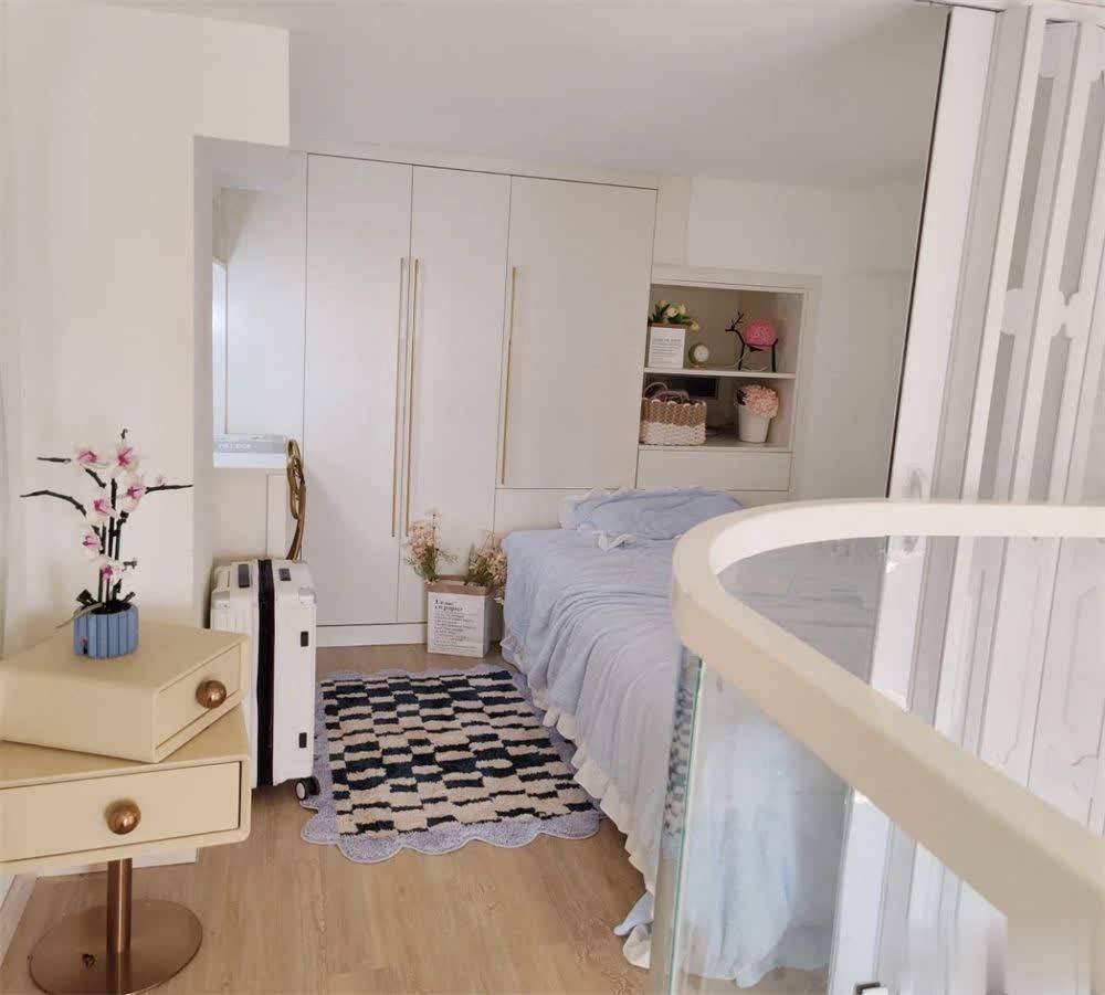 二层另一边是卧室,摆放一张双东谈主床,给星星小姐提供广宽舒心的寝息空间。床头装置通顶衣柜,衣物收纳挥霍。